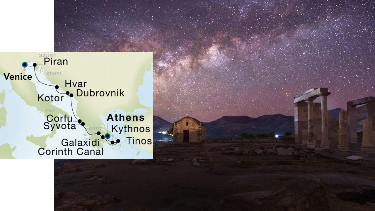 In addition to this rare celestial spectacle, historic cities and quaint seaside villages meet on your journey through Croatia, Montenegro, and Greece, bookended by ancient Venice and Athens. Journey along Croatia’s Dalmatian Coast, with time to explore the sunny seaside enclaves of Hvar, where your yacht overnights, and Kotor—dotted with private beaches and perfectly preserved Old Towns. Uncover Corfu’s rich multicultural heritage, historic monuments, and unsurpassed natural beauty. Delight in the coastal resort of Syvota, your gateway to a hidden paradise of unspoiled landscapes and unexplored beaches—perfect for swimming, biking, and hiking. Discover Galaxidi, is a small village perched on the northern coast of the Corinth Gulf, providing easy access to the UNESCO-awarded archeological site of Delphi. Enjoy a dramatic transit through Nero’s famed Corinth Canal. Explore Tinos’ timeless treasures from Volax to the vibrant capital of Chora, and Kythnos, where SeaDream drops anchor off Kolona Beach, a unique isthmus beach sitting between two breathtakingly beautiful bays.