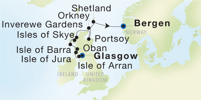 Glas Eilean offers a serene scenic passage along one of Scotland’s most untouched coastal landscapes, where rocky islets rise from clear waters and seabirds fly overhead. As SeaDream glides through this quiet stretch, you may spot seals basking on wave-washed rocks and notice the hills softly glowing under shifting light. The solitude of the coastline and stillness of the channels create a relaxing journey that showcases the untamed beauty of Scotland’s west coast.