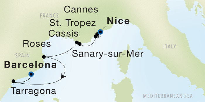Cassis is a small port situated east of Marseille in the administrative department of the Bouches-du-Rhone in the Provence-Alpes-Cote d’Azur region in southern France. It is a very popular tourist destination and is famous for its steep cliffs (falaises) and the sheltered limestone inlets called calanques. The wines of Cassis are white and rose, and not to be confused with creme de cassis, a specialty of Burgundy which takes its name from blackcurrants (cassis), not the village here. SeaDream anchors in the bay and offer a land adventure to the impressive Aix en Provence. Other options are taking a local boat to the calanques, hiking along the coast, visiting some of the local vineyards, water sports, mountain biking or simply relaxing in a Balinese bed on the yacht.